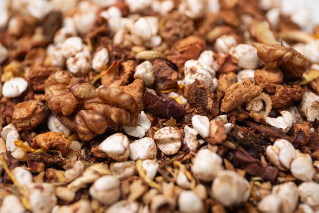 Rooïbos, Sobacha, noisettes entières, amandes effilées, fève de cacao, vanille bourbon, cerneaux de noix, sarrasin soufflé, noix de coco rapée, fleurs de souci