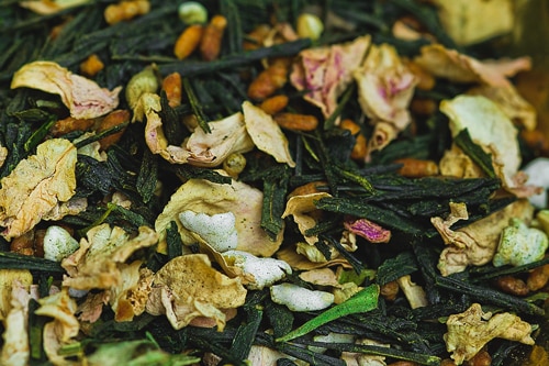 Thé vert Miyazaki, grains de riz soufflés et torréfiés, fleurs de cerisiers japonais, pétales de rose, spiruline