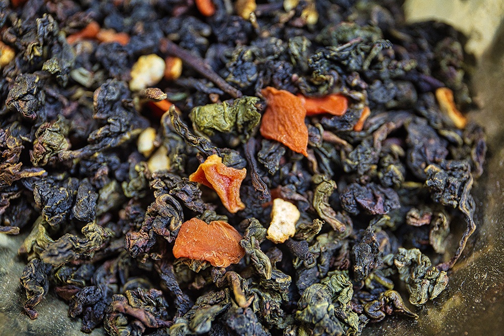 Oolong, Golden Népal, cueillette impériale, écorces de citron, feuilles de basilic, morceaux d’abricot et de carotte