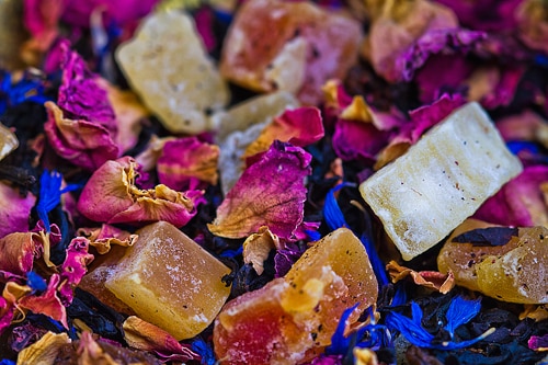Thé noir ceylan, mangue confite, pétales et boutons de rose, fleurs de bleuet