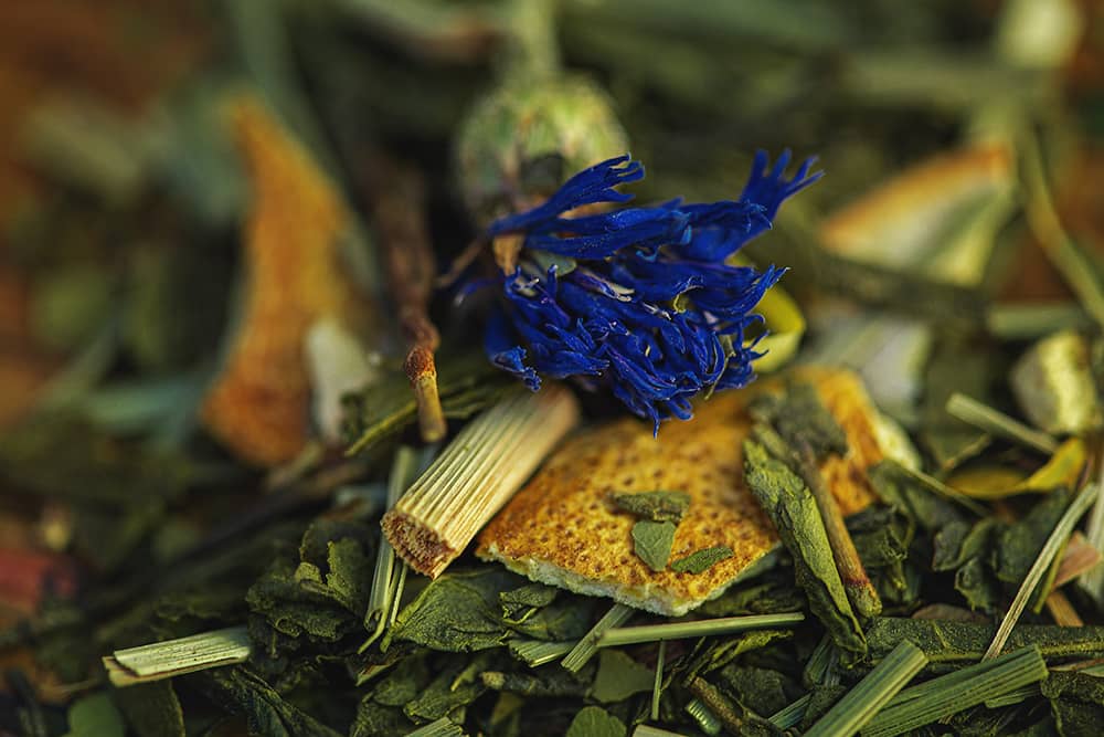 Thé vert japonais Sencha & Matcha, Maté vert, Guarana, feuilles de Stevia, écorces de citron, fleurs de bleuets. Un mélange explosif pour les sportifs