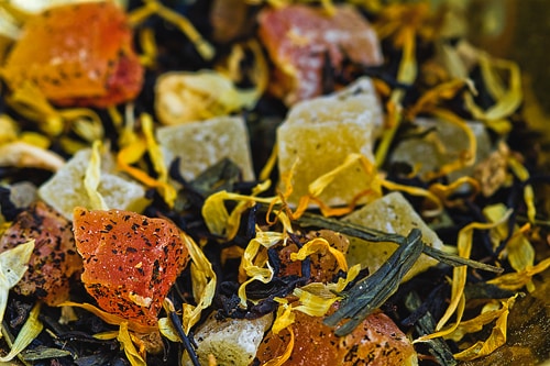 Thé noir ceylan, morceaux de mangue, papaye confite, fleurs de souci