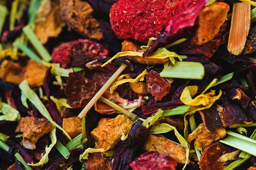 Infusion de romarin et thym frais, fleurs de lavande, bleuets, hibiscus, framboises, feuilles de framboisiers, citron