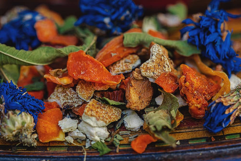 Infusion d’écorces d’orange, menthe poivrée, carotte, pomme, gingembre, feuilles de mûriers, verveine, passiflore, rooibos, fleurs de bleuets