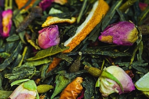 Thé vert Sencha, quartiers d’orange, amandes effilées, pétales et boutons de rose, cannelle, pomme