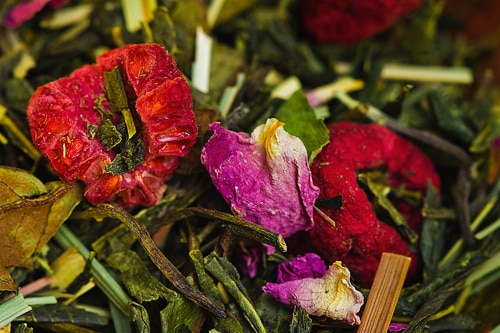 Thé vert Sencha, thé blanc Paï Mu Tan, bergamote, écorces de citron, framboises, boutons de rose
