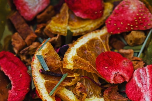 Infusion d’écorces d’orange, tranches de fraises, citronnelle, hibiscus
